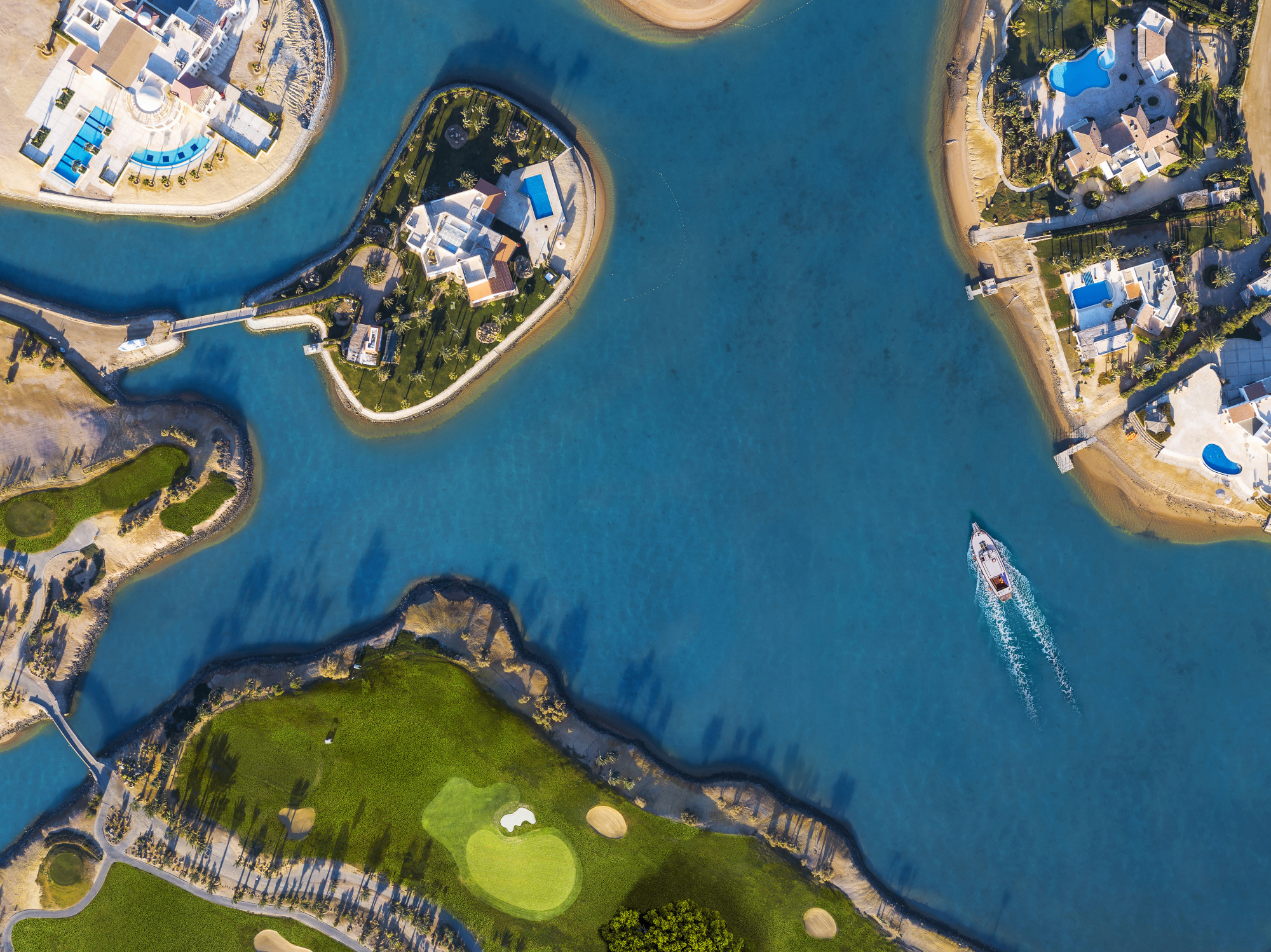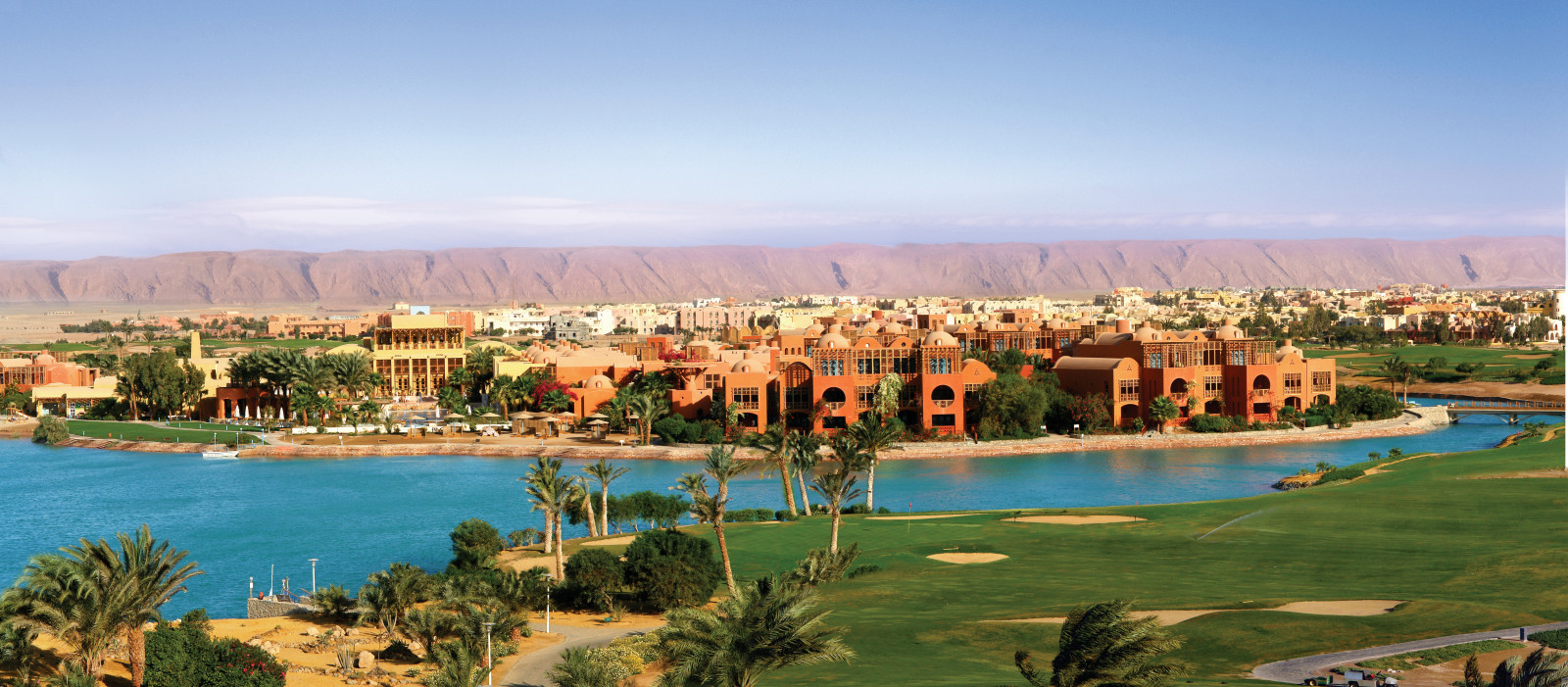 Nur wer El Gouna von oben betrachtet, kann die Genialität ihres Erbauers wahrnehmen. Mit dem Bau eines einzelnen Hotels begann vor über 30 Jahren die Erfolgsgeschichte. Heute ist die Region eine lebendige Stadt mit 25.000 Einwohnern, die alles zu bieten hat, was sich der erholungsbedürftige Tourist nur wünschen kann. Das 35 Millionen Quadratmeter große Areal besteht aus 20 Inseln, die mit gepflasterten Bogenbrücken harmonisch verbunden sind. Durch ihre Inselstruktur kann der Besucher in der malerischen Lagunenstadt jederzeit den Blick über den See oder das Rote Meer schweifen lassen. Das Urlaubsdomizil erstreckt sich über einen 10 km langen Sandstrand. Die strahlende Sonne, das Meeresrauschen und ein Gefühl von unendlicher Ruhe lassen hier den Alltag in weite Ferne rücken.